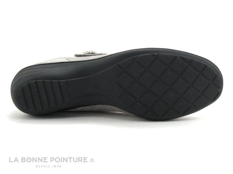 Cette chaussure Femme à bride salomé combine un cuir velouté beige métal avec un cuir à fins motifs argentés.