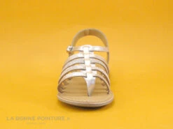 Ce nu-pieds fille à bride salomé est principalement en cuir blanc, avec des lanières argentées sur l’avant.