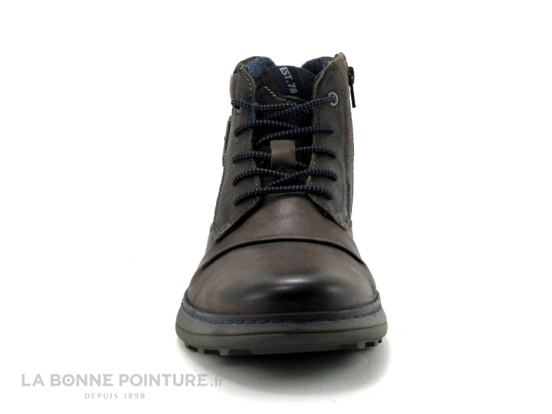 Cette bottine Homme Bugatti Percy est en cuir marron foncé, travaillé avec des traces d’usure et des irrégularités pour un style « used » et authentique qui caractérise la marque Bugatti chaussures.