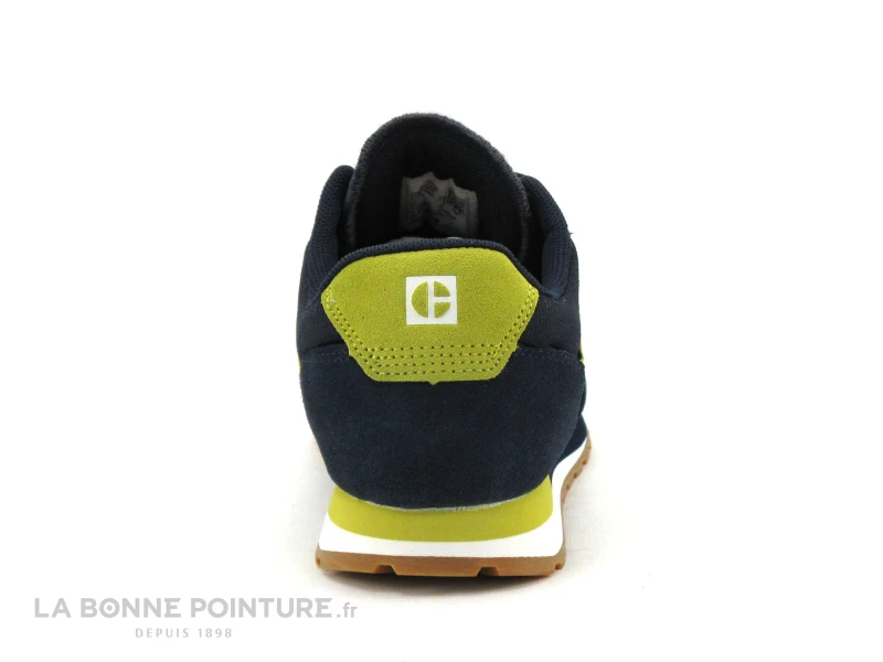 Cette basket basse Homme Caterpillar Ventura associe textile et cuir velours bleu foncé, avec une petite touche de vert lime à l’arrière.