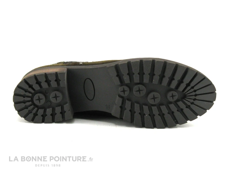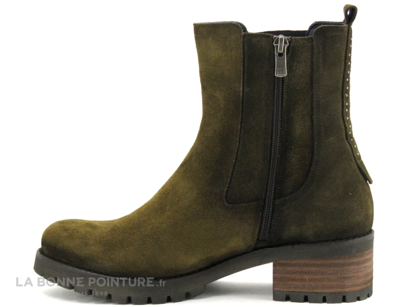 Superbes avec leur coloris kaki foncé, leur talon épais mode et leur semelle crantée, les bottines Femme Dorking Glass D8824 by Fluchos !
