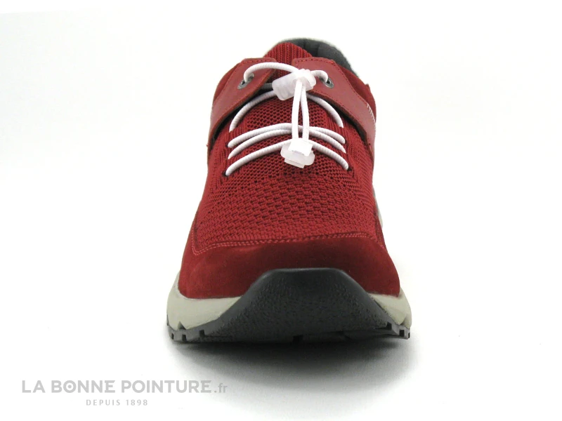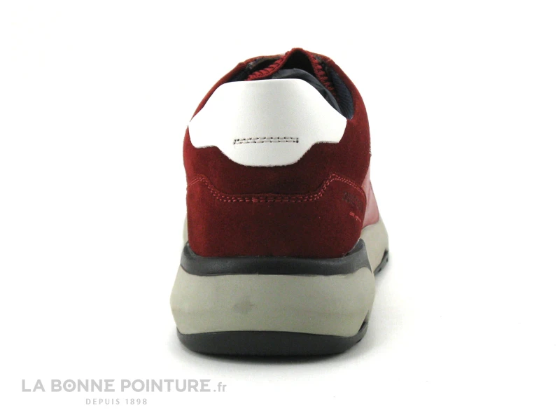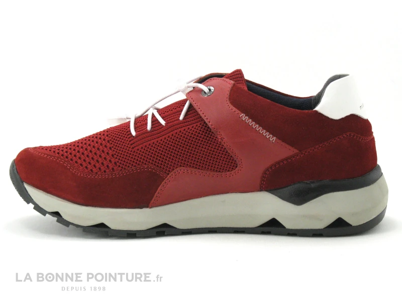 Cette basket homme Josef Seibel Jeremiah mélange cuir velours, cuir lisse et textile maille rouge, avec une partie en cuir blanc à l’arrière.