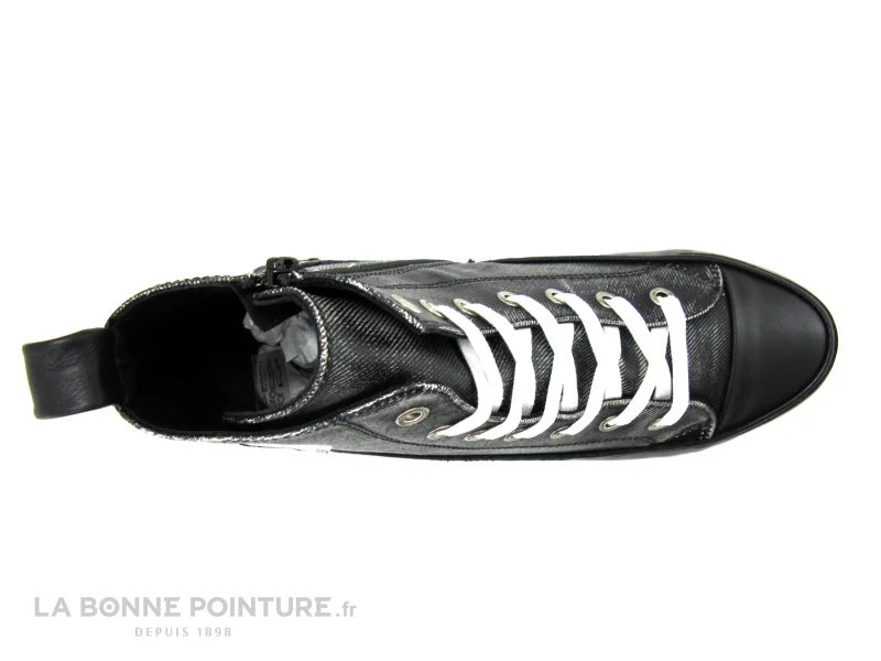 Cette chaussure montante Femme à plateforme mélange des parties aspect jean grisé/nuancé et noires, pour un effet mode et vraiment original.