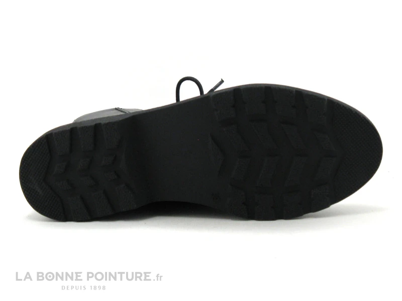 Cette bottine Femme Ă lacet est en cuir lisse noir, avec 5 oeillets de forme trapĂšze mĂ©tallisĂ©s qui donnent de l’allure au modĂšle, traversĂ©s par un lacet rond noir.