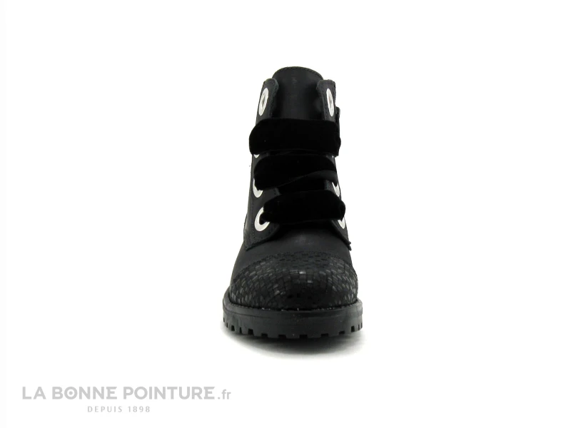 Cette bottine est en cuir noir à l’aspect mat, avec l’avant en cuir velouté effet craquelé.