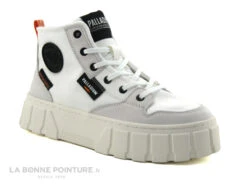 Cette basket montante Femme Palladium Pallatower associe toile blanche et cuir velouté blanc grisé.