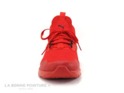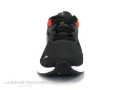 HabillĂ©e de bandes blanches sur les cĂŽtĂ©s, la chaussure Puma possĂšde une petite languette rouge Ă l’arriĂšre, qui aide Ă enfiler la chaussure.