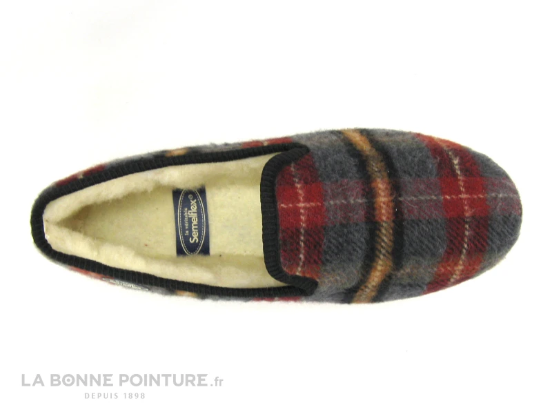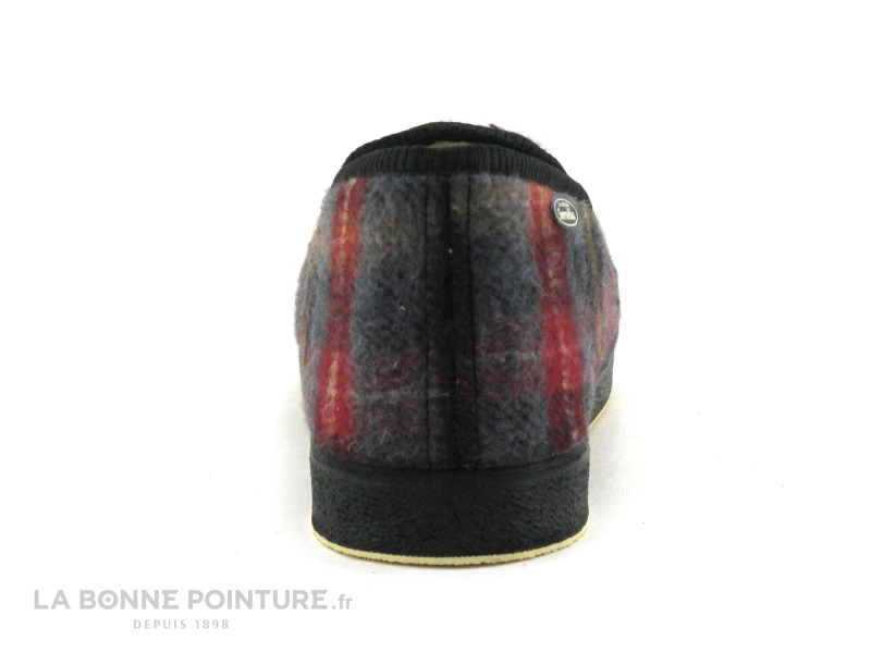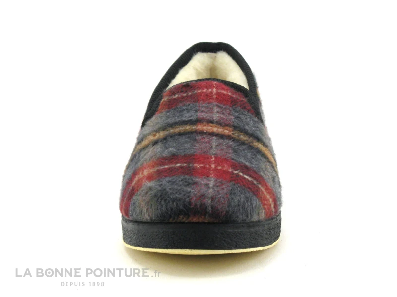 Ce chausson homme est en textile à carreaux bordeaux, noir et gris, avec une touche de marron orangé et de beige.