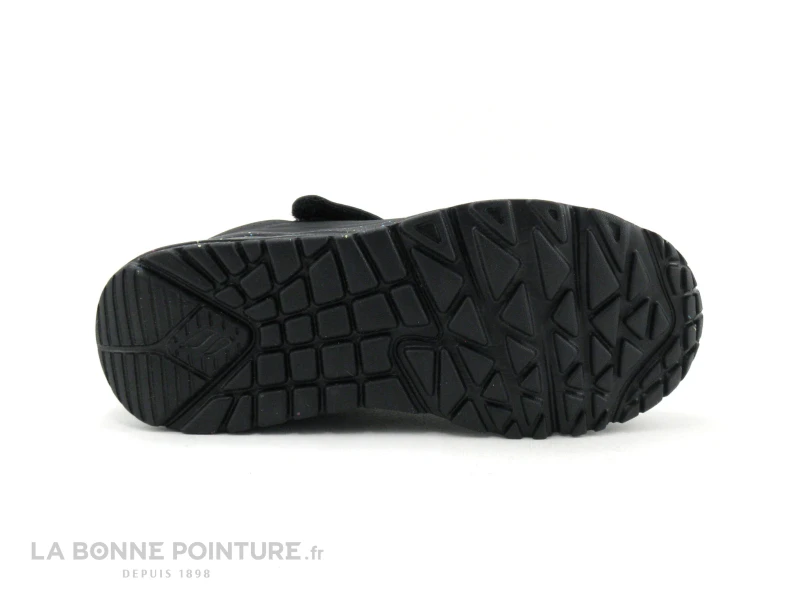 Cette jolie basket fille compensée Skechers Uno Lite est noir mat, avec la doublure multicolore que l’on aperçoit autour de la cheville.