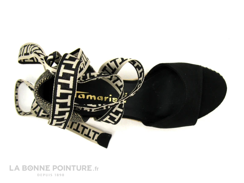 Le nu-pied Tamaris est constitué d’un contrefort arrière en toile imprimée noire et beige.