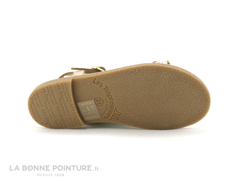 Ces jolis nu-pieds fille Tropéziennes sont en cuir métallisé Or, avec une lanière tressée et la petite plaque gravée « Tropéziennes par M. Belarbi » sur l’avant.